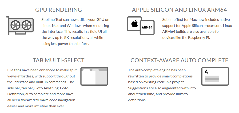 Sublime Text는 가볍고 빠른 성능을 자랑하는 텍스트 에디터입니다. 성능은 사용 환경, 파일 크기, 플러그인 설치 개수 등에 따라 달라질 수 있습니다.